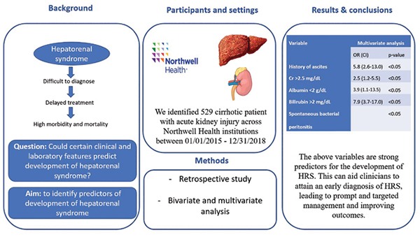 A recent retrospective case-control study conducted by Sasso et al. evaluated 529 cirrhotic patients admitted with AKI across multiple Northwell-health hospital sites in New York City. The primary outcome was development of HRS-AKI during hospital stay. Patient variables including demographics, past medical history, laboratory data, medication history and hospital complications were evaluated to determine predictors of the development of HRS-AKI in this cohort of patients.