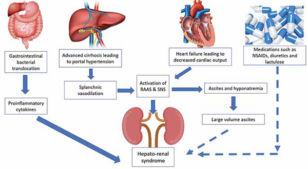 Furthermore, several clinical conditions have been linked to the development of HRS-AKI. Worsening ascites can cause elevated intra-abdominal pressures leading to compression of the renal vasculature and worsening kidney dysfunction. Some studies have demonstrated that large volume paracentesis may be associated with HRS-AKI secondary to intravascular fluid shifts and potentiation of the renin-angiotensin-aldosterone system. Spontaneous bacterial peritonitis results in a hyperinflammatory state that has been suggested to precipitate HRS-AKI and cardiogenic shock results in decreased effective intravascular volume, contributing to renal dysfunction. Additionally, certain medications such as diuretics, non-steroidal anti-inflammatory drugs and lactulose may contribute to HRS-AKI (figure 2).